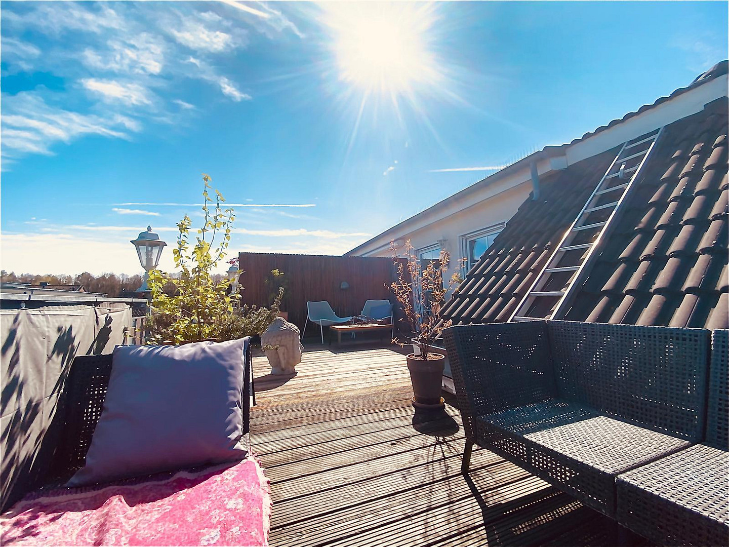 The heart of the apartment is the spacious living room with access to the fantastic 25 m² south-east-facing roof terrace, ideal for sunny breakfasts or relaxing evenings outdoors. The modern, fully equipped kitchen with dishwasher, oven and fridge-freezer leaves nothing to be desired. The elegant daylight bathroom has a corner bath and a separate shower. A comfortable double bed (180x200) and a large closet await you in the bedroom.