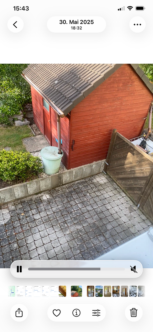 The garden shed stands on the border to the neighboring property and can be used half of the time. The two oversized parking spaces in front of the house are separated from the neighboring property by a cherry laurel hedge.