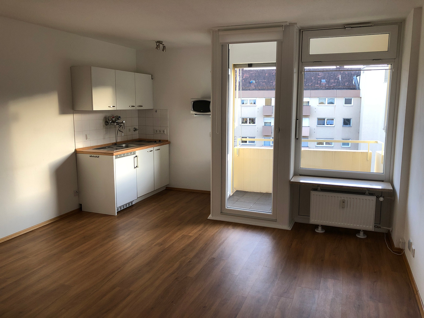 With its ideal floor plan, the apartment is very bright due to the window front and has a beautiful, quietly located balcony with a view of the inner courtyard and is equipped with WPC flooring and an awning.