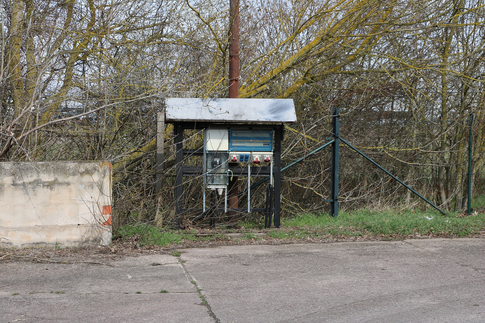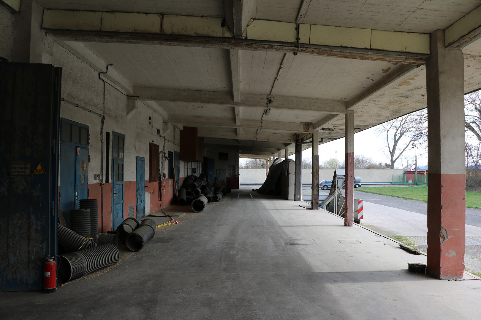 -Massive cold hall, single-storey, gable roof, concrete column construction with prefabricated parts, partly trapezoidal sheet metal cladding