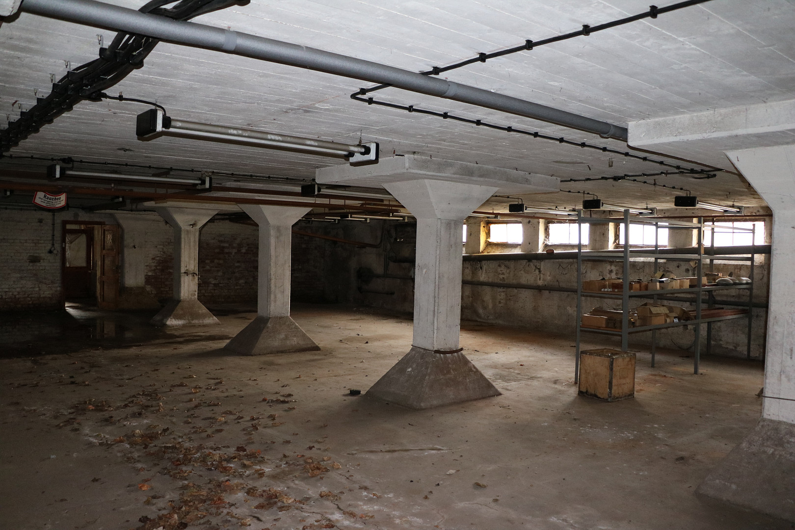 -massive cold hall, single-storey, gable roof, concrete column construction with prefabricated parts, partly trapezoidal sheet metal cladding