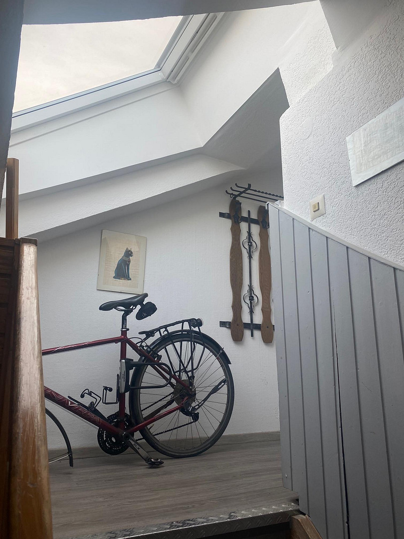 The hallway provides access to the loft via a pull-down staircase. You can eat together in the spacious eat-in kitchen. The modern bathroom has a window and a bathtub. There is parquet flooring throughout the apartment.