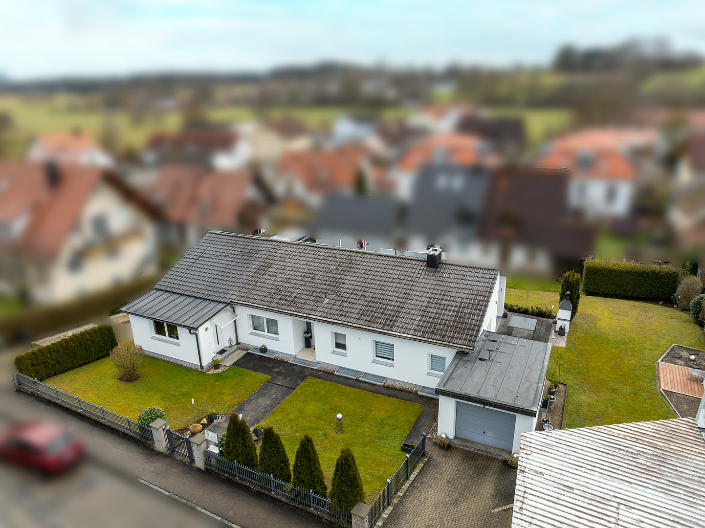 The existing building is currently used as a residential building and the extension as an office and beauty salon (two separate entrances). The planning of the extension allows for a variety of other possible uses, e.g. as an additional rental unit or supplementary residential unit. The property was repainted with high-quality silicone paint just 4 years ago and the access path, the garage entrance and the terrace were also repaved just a few years ago. A current calculation of the living/usable space was carried out by an independent expert.