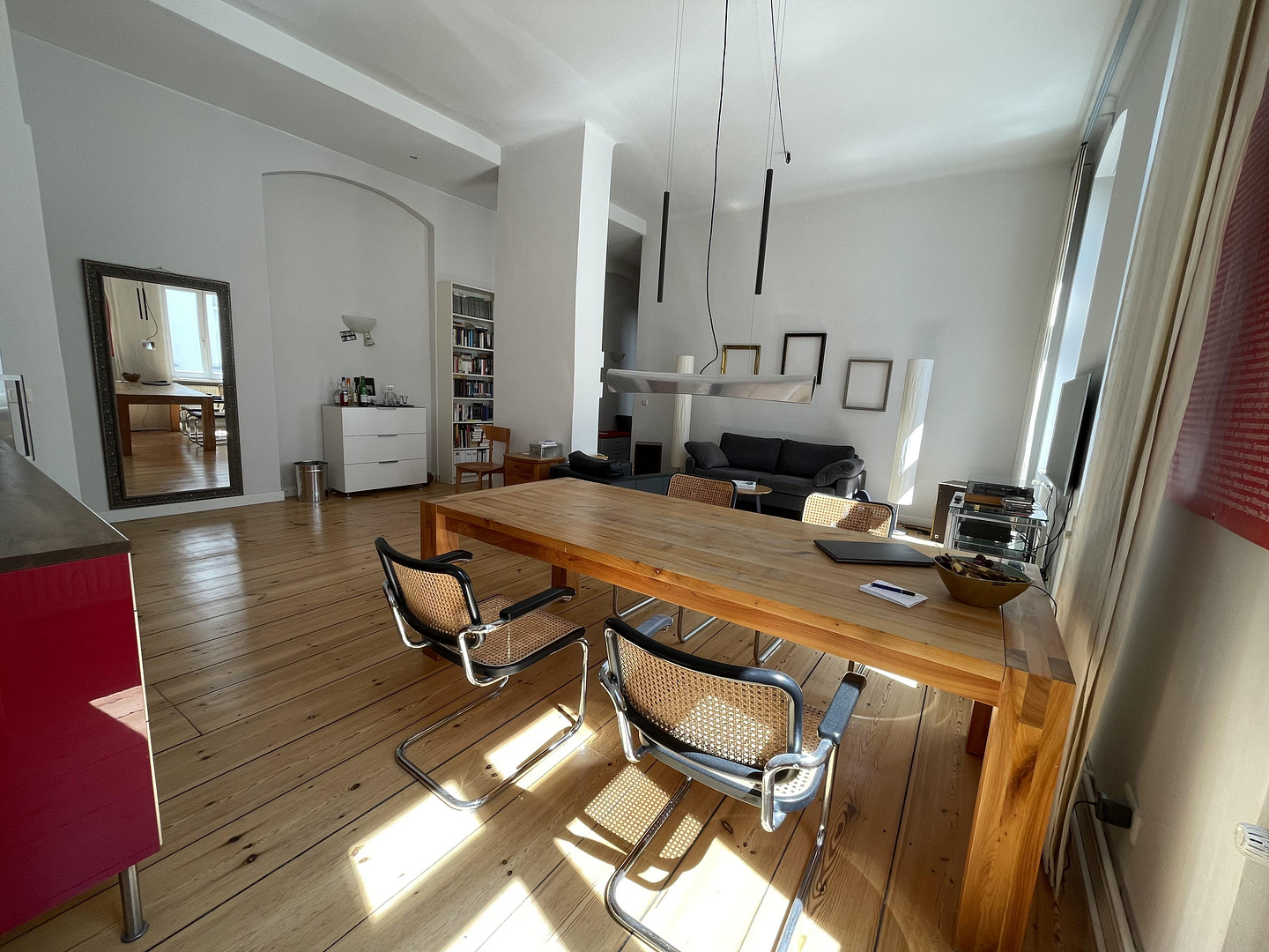 Keithstraße 16, 10787 Berlin (Schöneberg)This exceptionally bright apartment in an old building is located on the 4th floor of the quiet side wing of a well-kept, leafy old Berlin building - a retreat in the heart of the city. The consistent south-facing orientation towards the inner courtyard, ceiling heights of over 3 meters and large wooden-framed insulating glass windows create an impressive sense of space and a light-flooded living atmosphere. There is no elevator.
