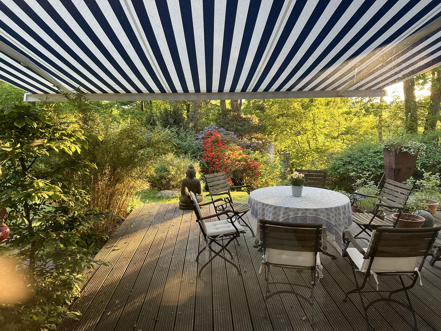 A spacious staircase leads down to the garden level. Here you will find a light-flooded living and dining area with an unobstructed and impressive view of the natural garden and the valley. +++ Also located here is the fully equipped eat-in kitchen, renovated in 2015, with dining area and access to the laundry room and storage rooms on the same level. From here there is access to a large covered veranda, where you can sit together even in changeable weather or in the transitional seasons, to another terrace with awning and into the large mature garden. +++