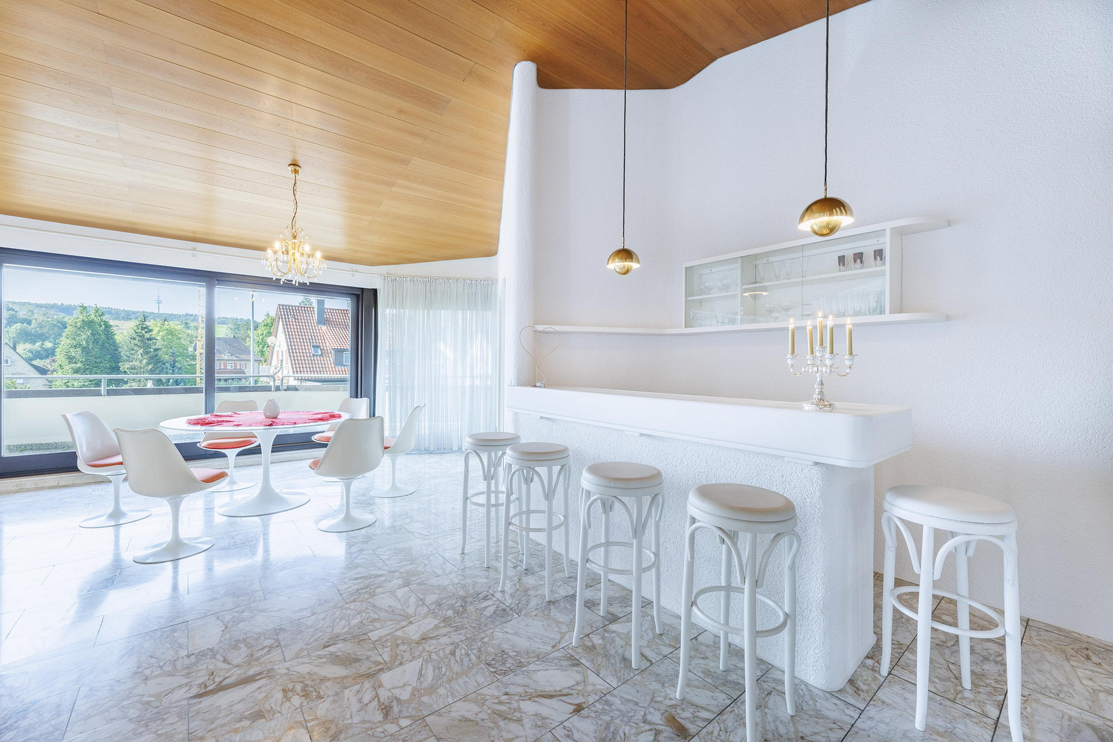 The spacious living and dining area with integrated bar forms the heart of the house. The south-facing orientation and the large windows create a very pleasant, bright living atmosphere. From here, the view extends over the surrounding rooftops and far into the countryside - an unmistakable advantage of the slightly elevated location.