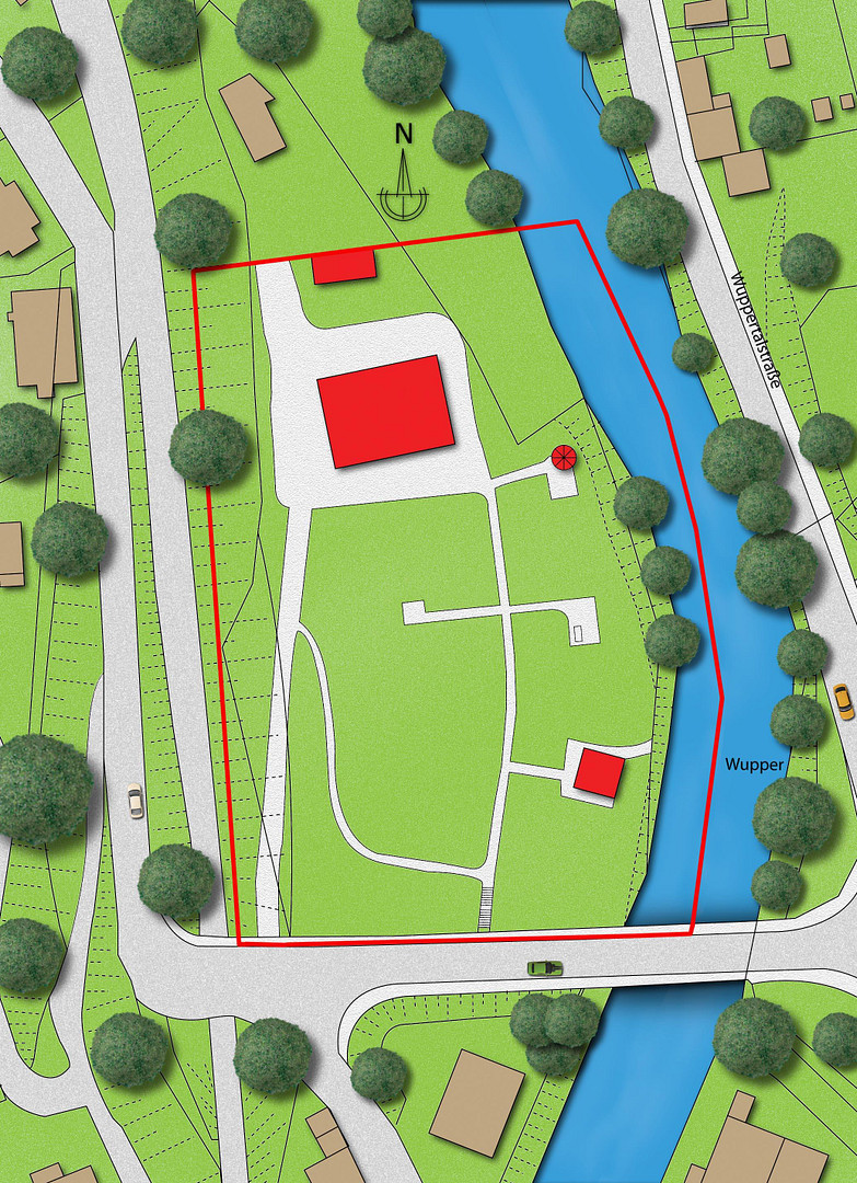 The plot of almost 1 hectare is barely visible and consists of a beautifully landscaped castle park and an adjoining green building plot. It is accessed via a long, gated driveway that leads through the side of the well-kept park and garden. The plot borders the river on one side, giving you direct, very private access to the Wupper via a few steps.
