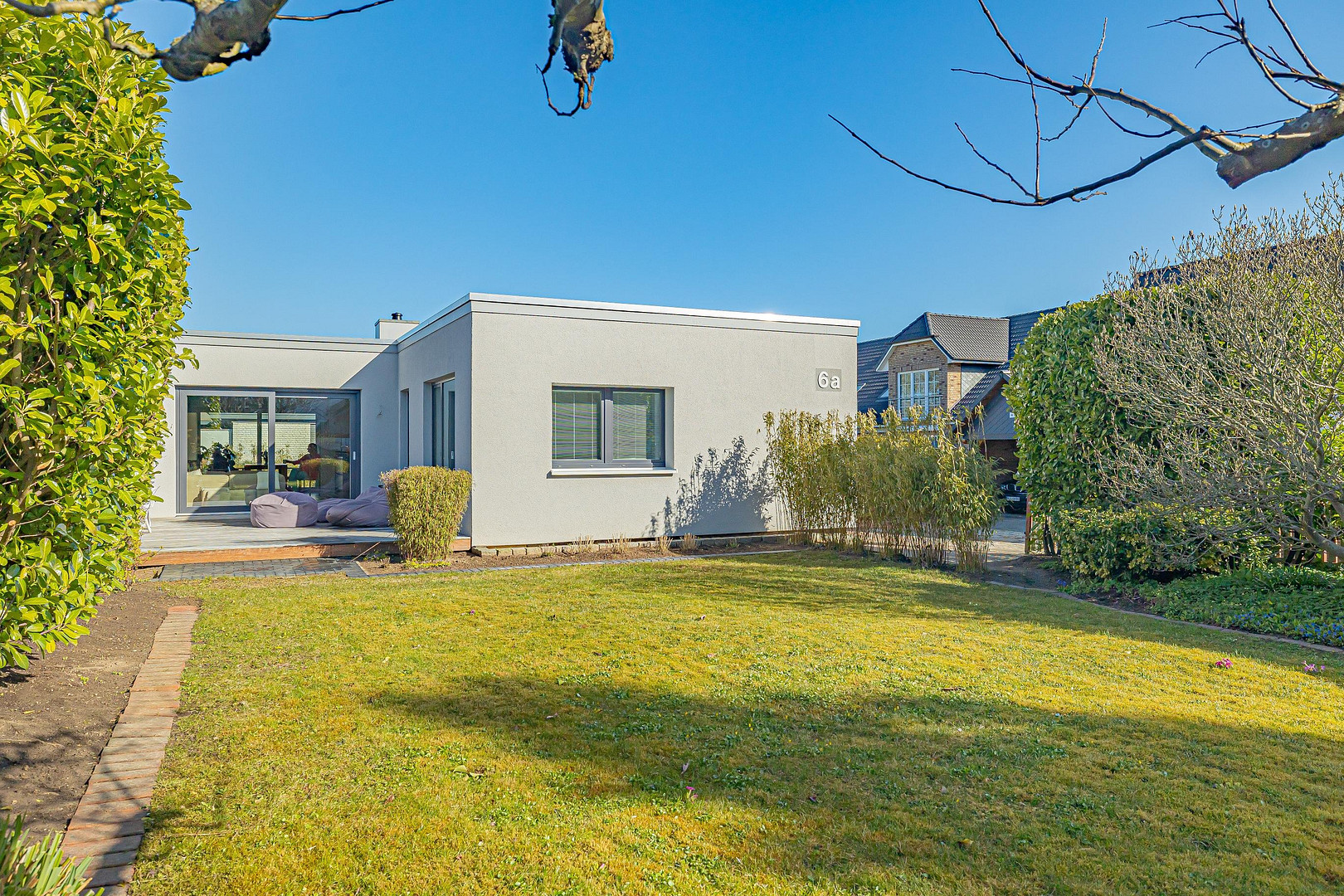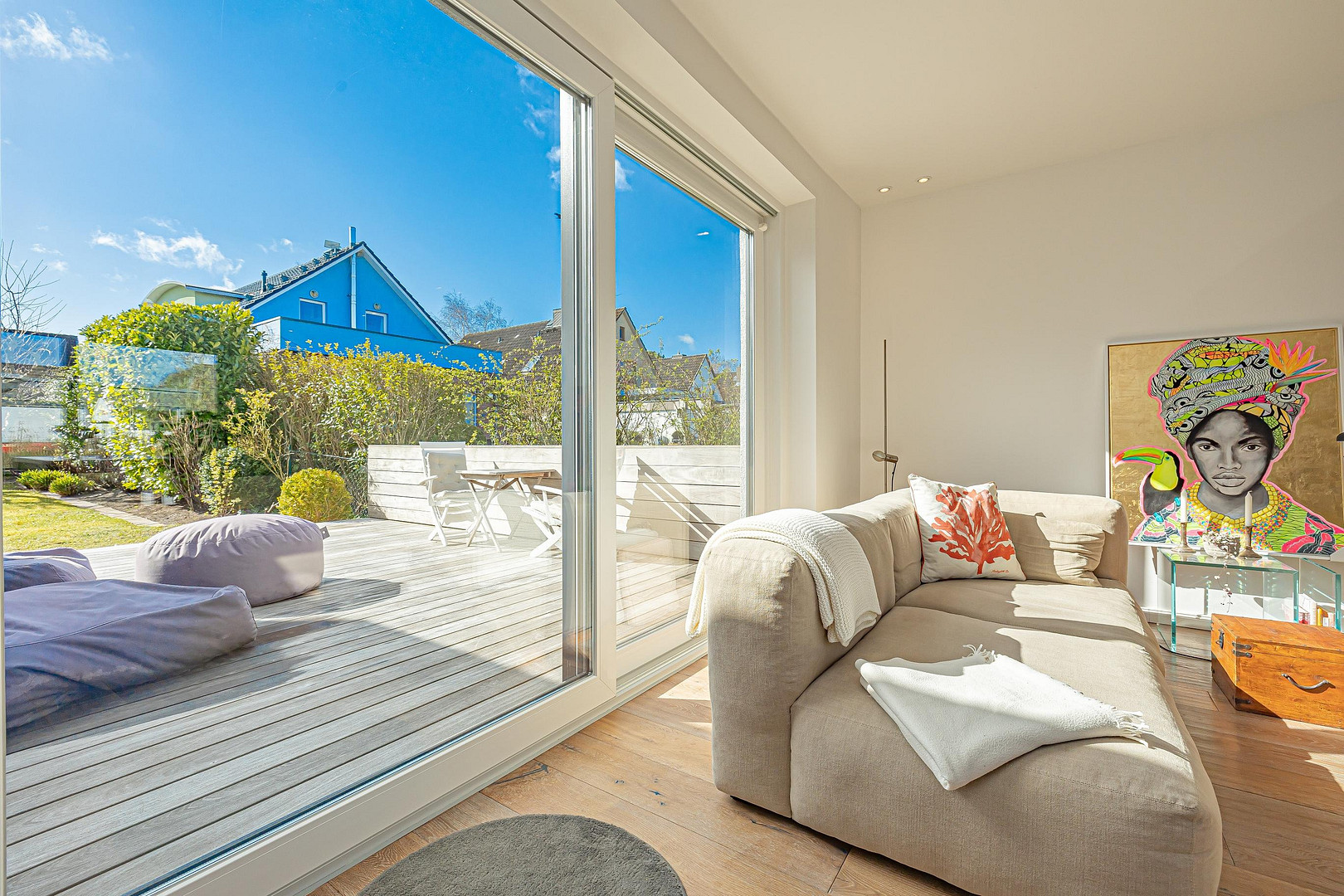 The property was completely renovated in 2015 with great attention to detail. The planed oak floorboards and the floor-to-ceiling windows are just one example of this. Just last year, a second terrace was built with very high-quality Ipe wood and is directly adjacent to the kitchen and dining area. In summer, there is a "convertible feeling" when all the windows in the spacious dining and living area are open, as the two terraces are directly adjacent and on the same level as the living area.
