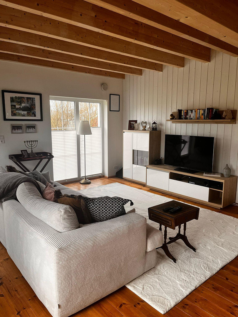 This is a wooden house, both inside and out. Built and renovated to the highest ecological standards, using no harmful substances. With a geothermal heating system, an excellent blower door test result, an insulated concrete slab with underfloor heating, solar panels on the roof, and a bus control system for the lights and switches, it leaves nothing to be desired. This house corresponds to a "KfW 20" rating, ensuring a future-proof and low energy consumption.