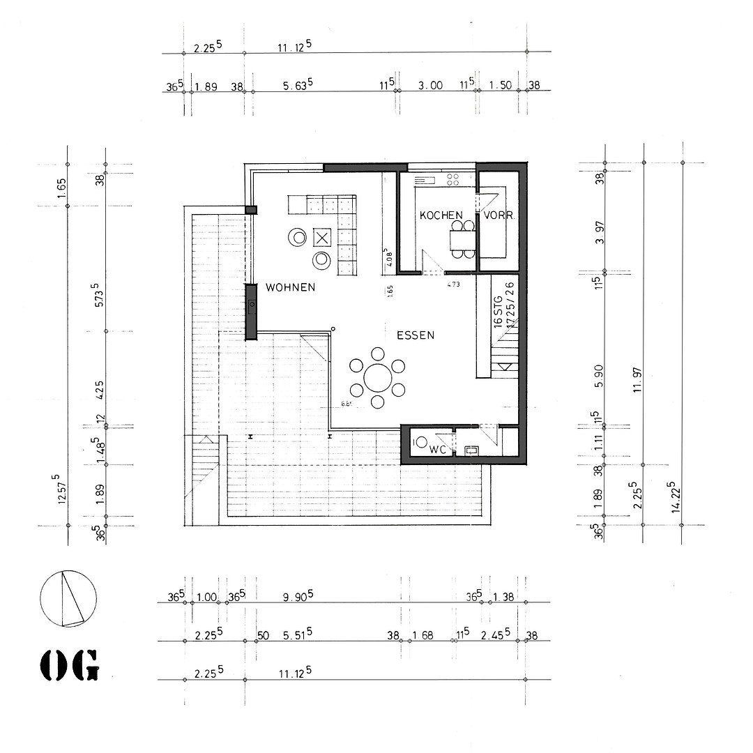 The detached house was built in 1977 as a flat-roofed bungalow with a total living area of approx. 173 m² and an additional 10 m² utility room and 17 m² integrated garage.