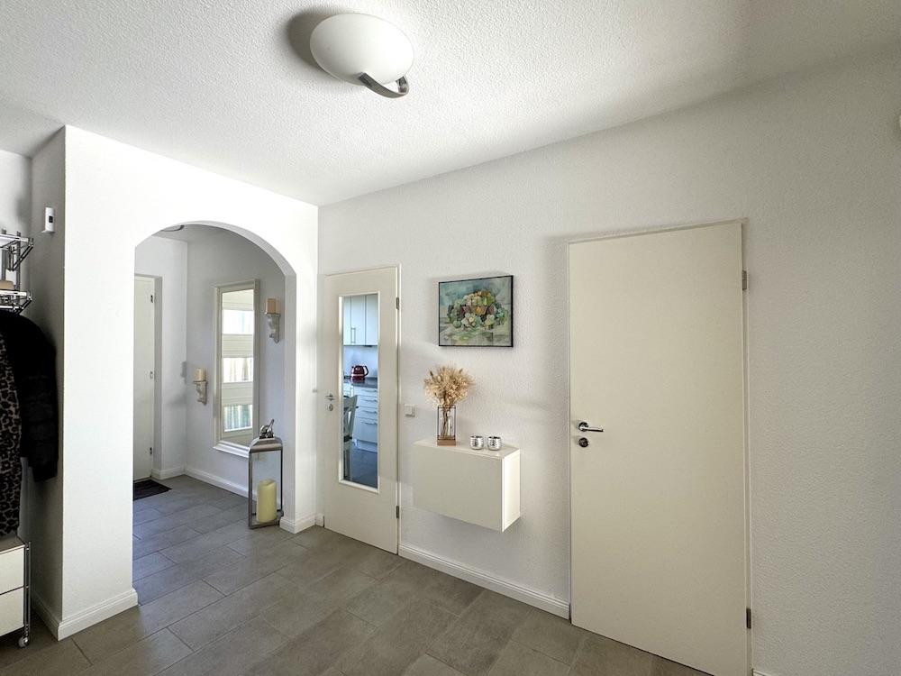 The first floor welcomes you, via a vestibule, in a spacious hallway that offers ample space for your wardrobe. The open floor plan leads you directly into the light-flooded living and dining room. This spacious room is equipped with floor-to-ceiling door-window systems that let in plenty of natural light and provide several direct access points to the cozy Bangkirai terrace and the lovingly tended garden. It offers enough space for a dining table and a large sofa area. The floor is laid with high-quality designer flooring, which gives the room a modern atmosphere.