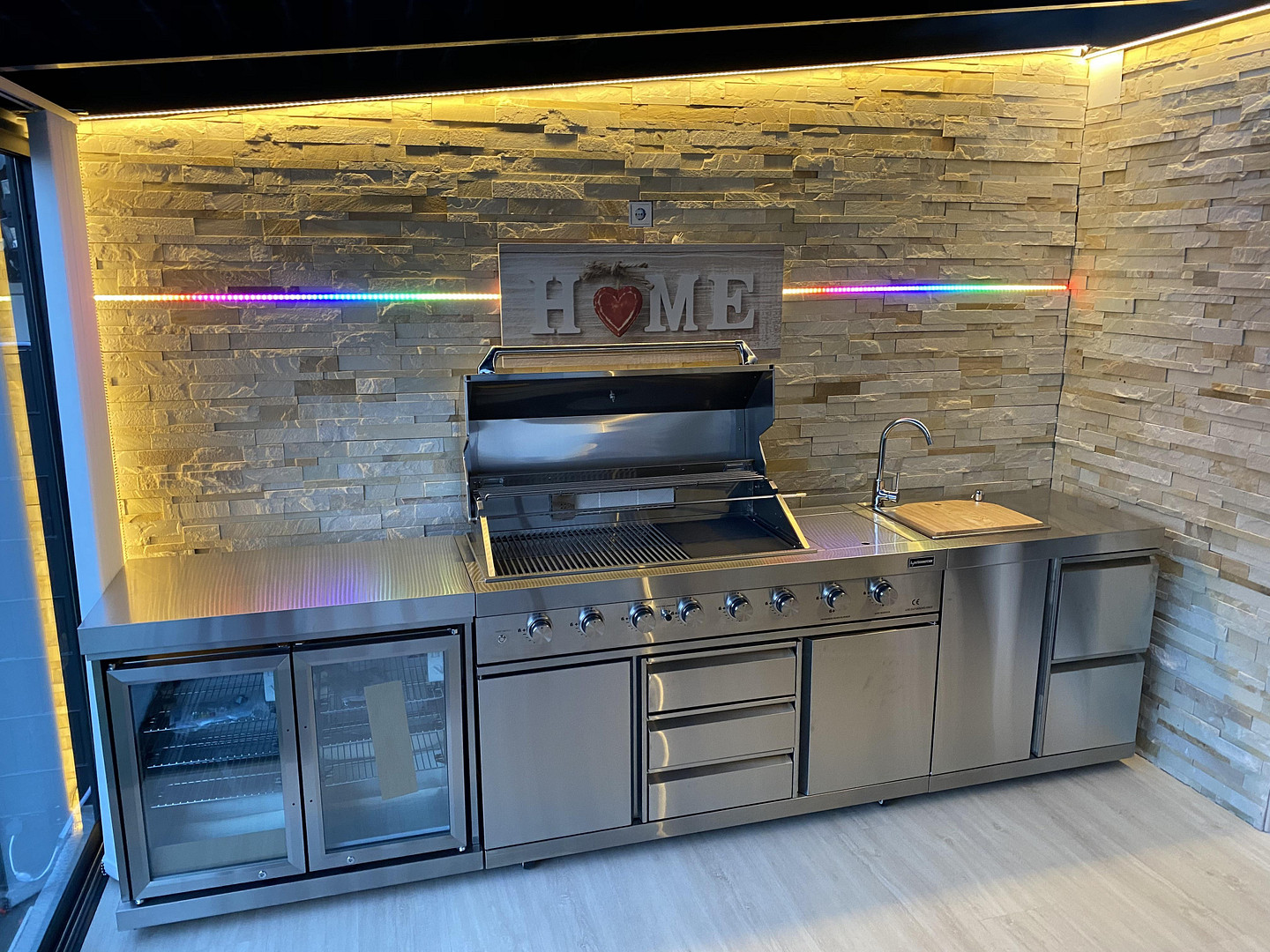 Outdoor kitchen (approx. 7000 euros including appliances) with large grill, double fridge, pizza oven, sink with hot/cold water for an extra charge