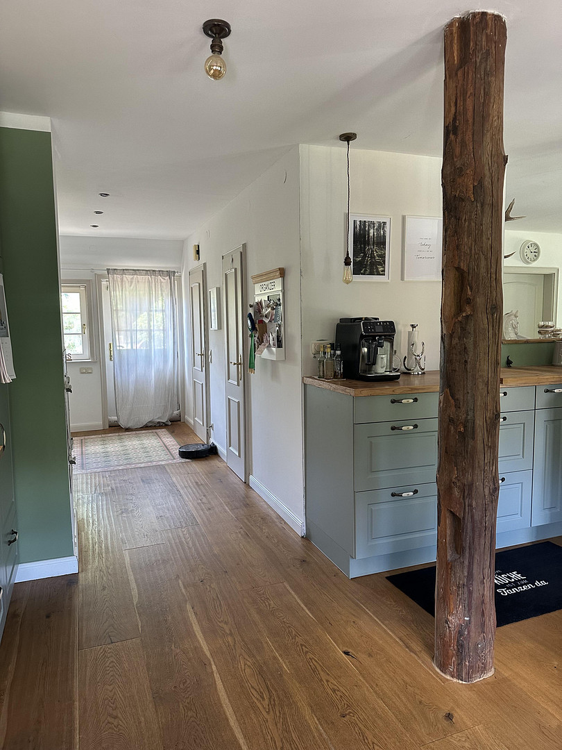 The first floor has beautiful wide oak plank flooring, with the exception of the bathrooms and living room (tiles and laminate).