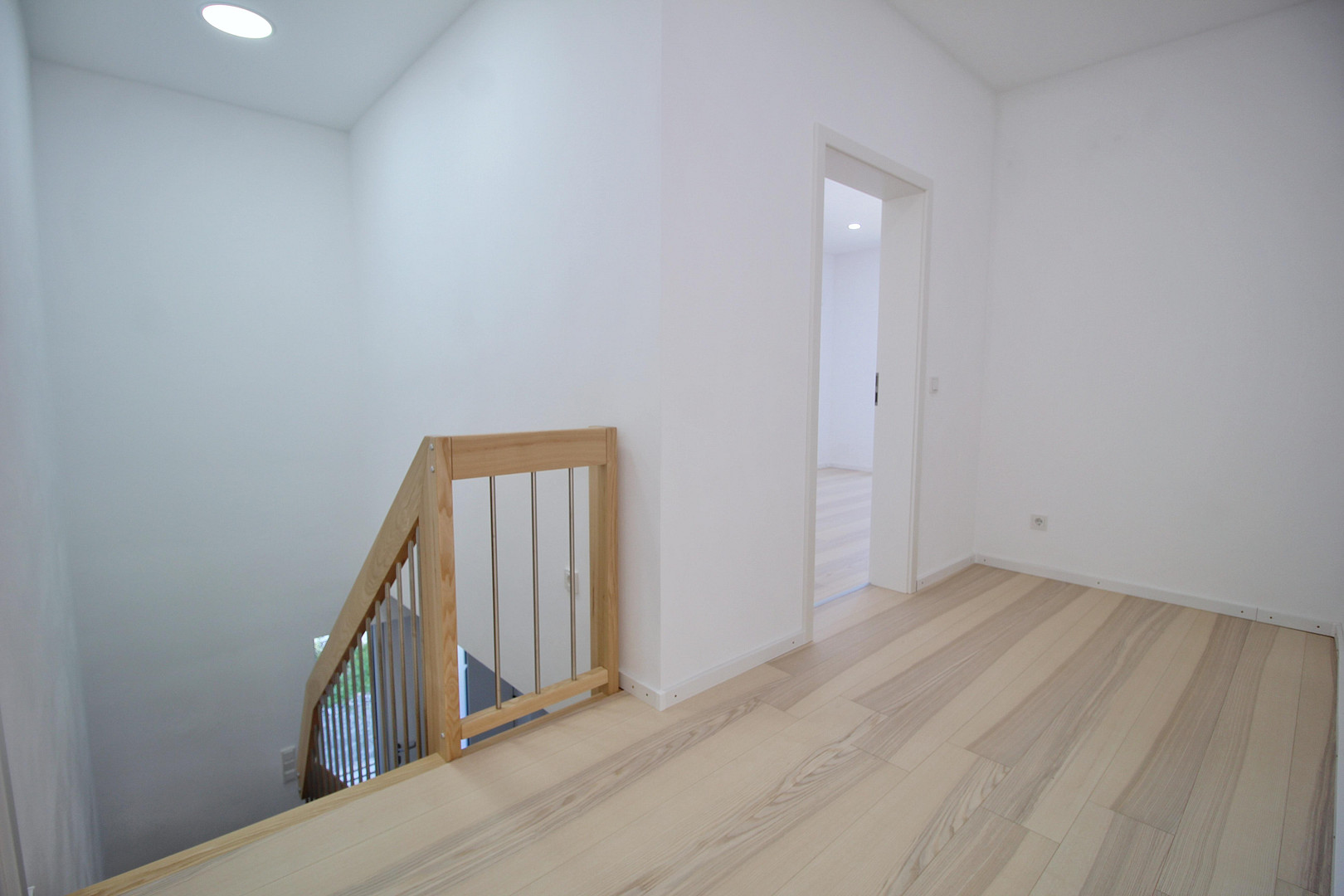 - Open solid ash wood staircase with stainless steel applications