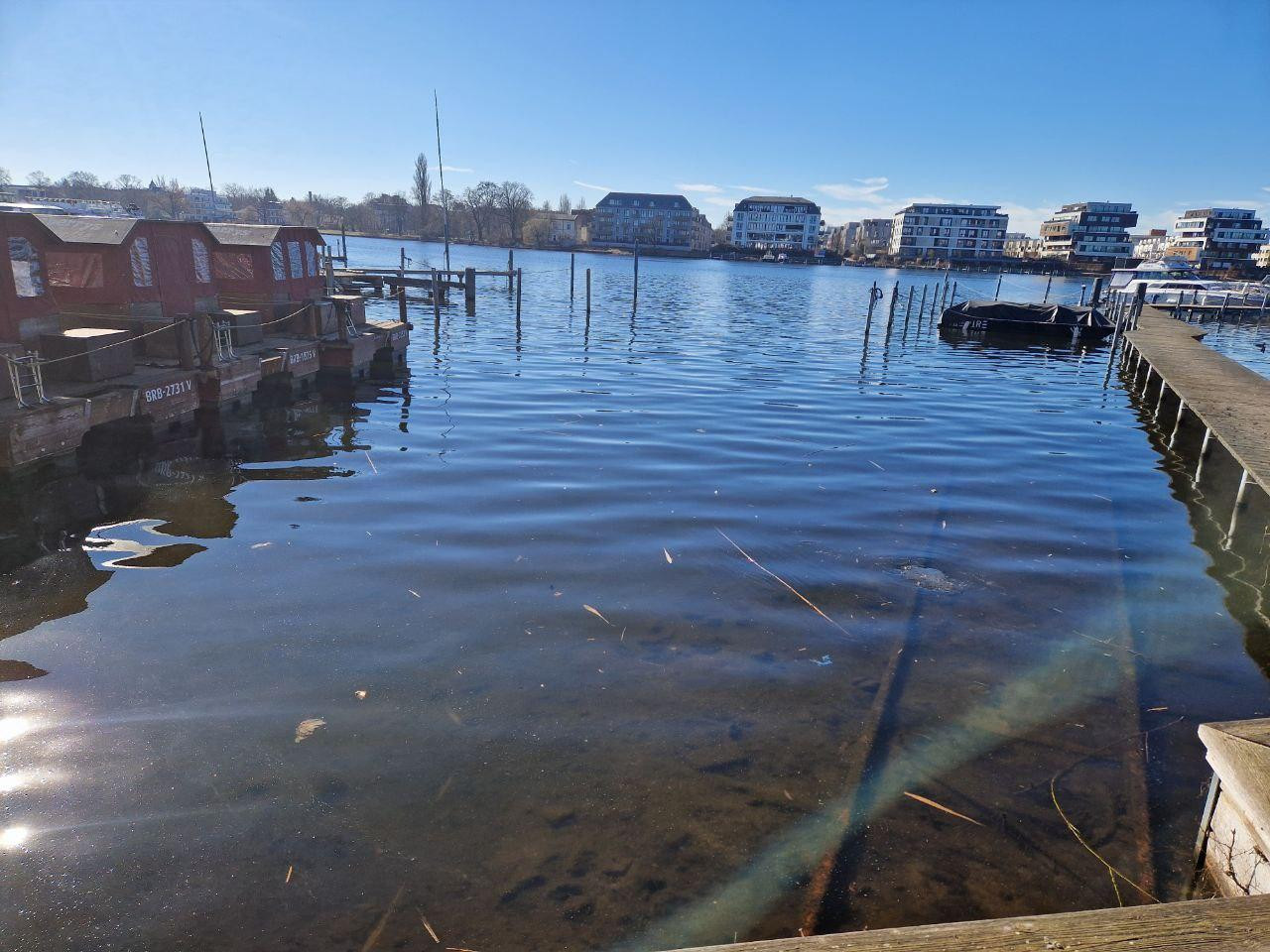12557 Berlin (Köpenick)This comfortable and well-maintained apartment is located on the 2nd floor of a townhouse (built in 2016) in a quiet, gated residential complex with a boat dock and underground parking, directly on the Dahme river. All windows and the balcony offer views of the Dahme river and a group of trees.