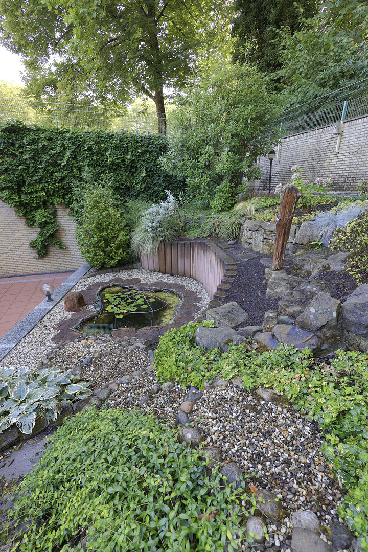 The elaborately landscaped plot and the well thought-out room layout make this property an ideal home for families or discerning couples looking for privacy, tranquillity and freedom of design. The outdoor area is equipped with several terraces, so you will always find a shady or sunny spot. The plants, pond and water feature are laid out at different heights. The entire garden and the front garden have an electronically controlled sprinkler system with well water, so you don't have to worry about watering.