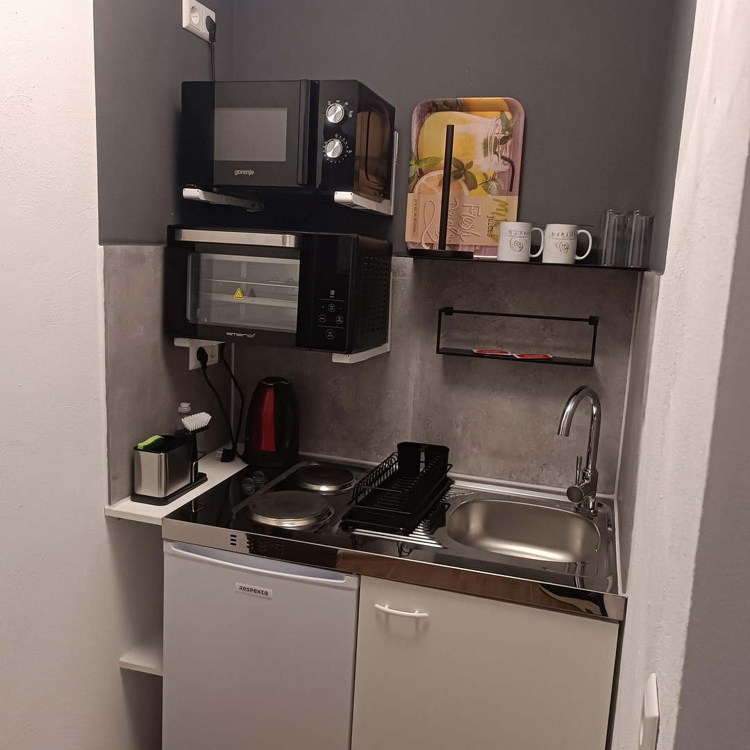 In the entrance area there is a kitchenette with sink, fridge, 2 hotplates and microwave. A few steps down you will find the bedroom, which is furnished with a double bed, small table, two chairs and a TV. From there you can enter the bathroom with shower and WC. There is also access to the small terrace at street level.
