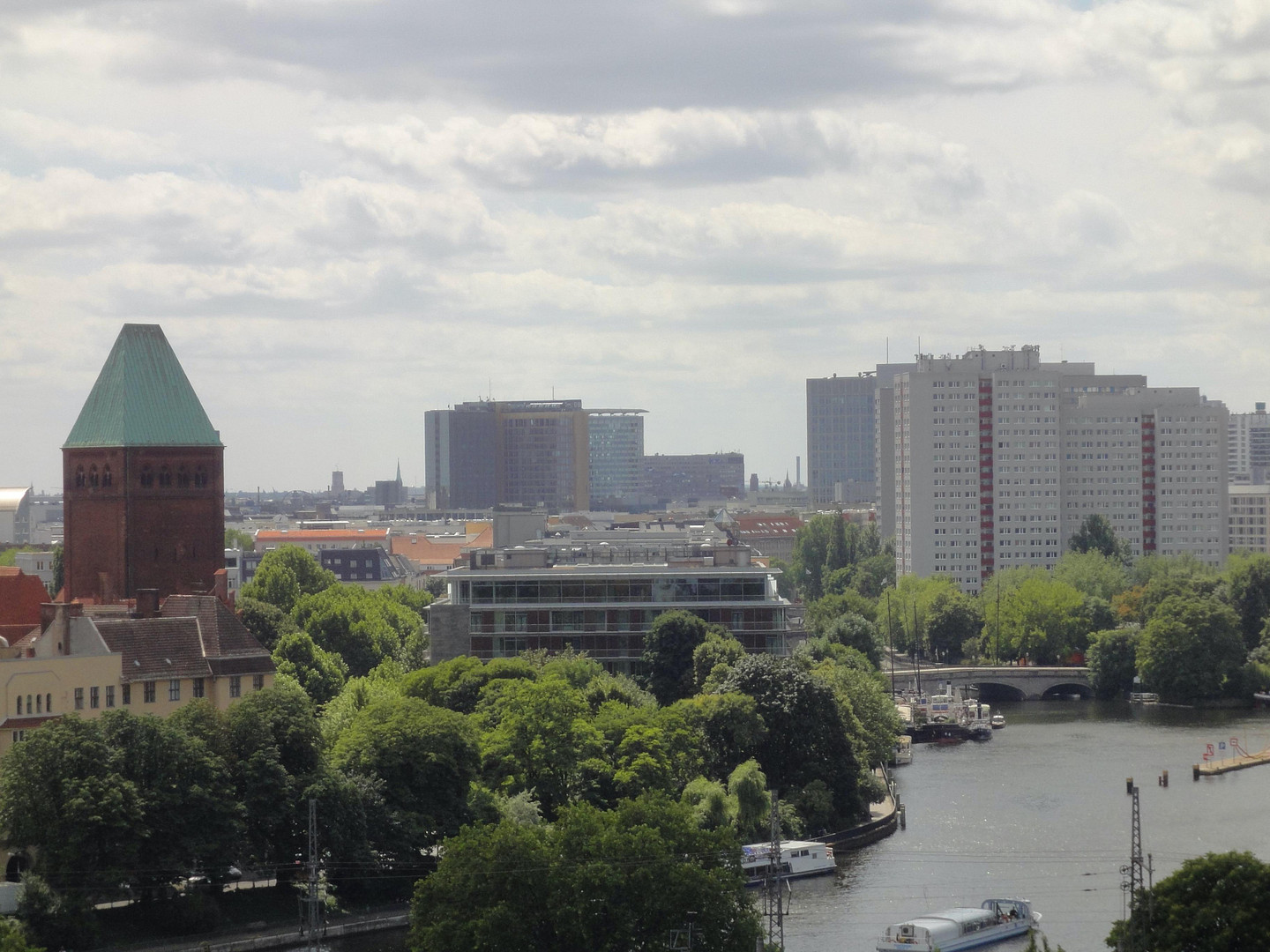 Afternoon/evening sun through all windows, views as far as Spree/Mitte