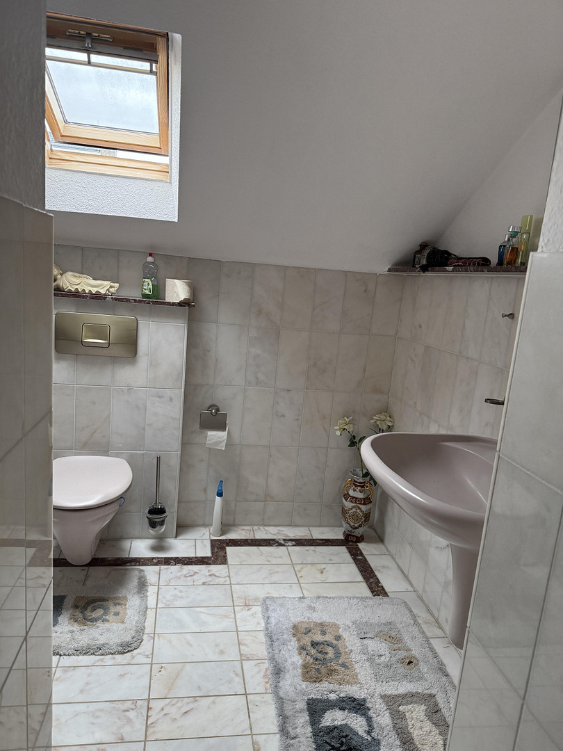 On the upper floor, the comfortably equipped bathroom has been arranged in a larger area, as well as the bedroom with walk-in closet and a children's room. There is also a small west-facing balcony.