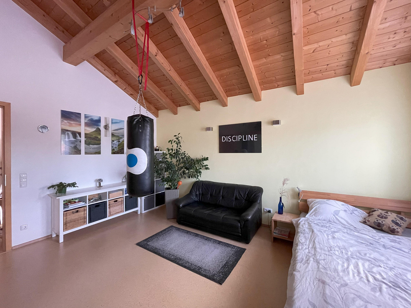 The ground floor offers a spacious kitchen (the kitchen including all appliances is not included in the purchase price) and a generous living/dining room with floor-to-ceiling windows and a cozy Swedish stove. The light-flooded conservatory facing east/south/west offers additional space. There are two further rooms on this floor, which can be used as a guest room or office, for example. A guest WC and a utility room with shower round off the offer.