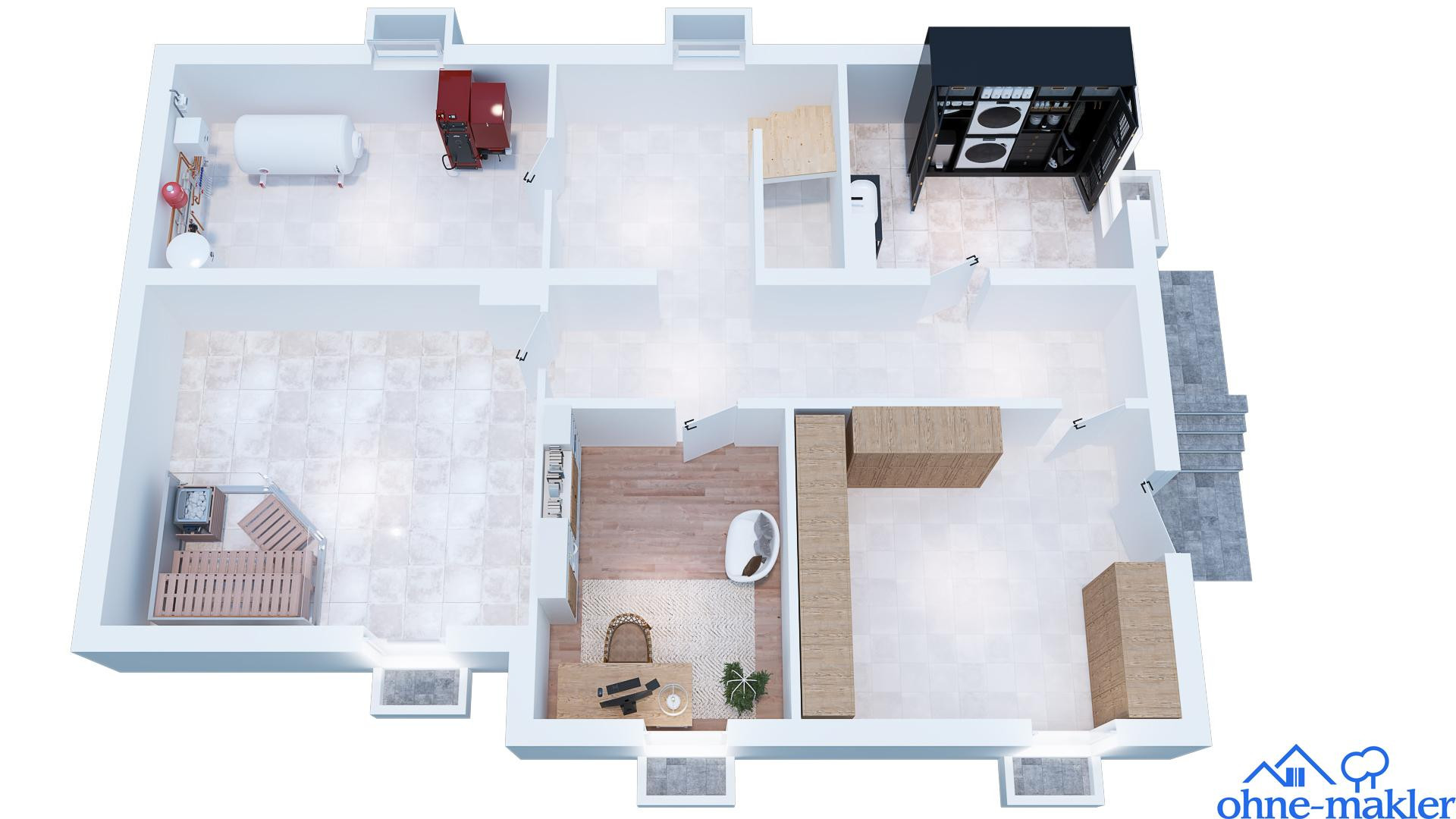 In the largest room is the sauna with additional steam function for relaxing hours on cold days. Underfloor heating heats the tiled floor here. The room next to it has laminate flooring and radiators and was used as an office. An additional external cellar staircase leads to the workshop, which has a power connection. The fifth cellar room has a sink and a floor drain and can be heated by a wood-burning stove. This room was originally designed as a laundry room and is equipped with a brick platform for the washing machine and dryer.