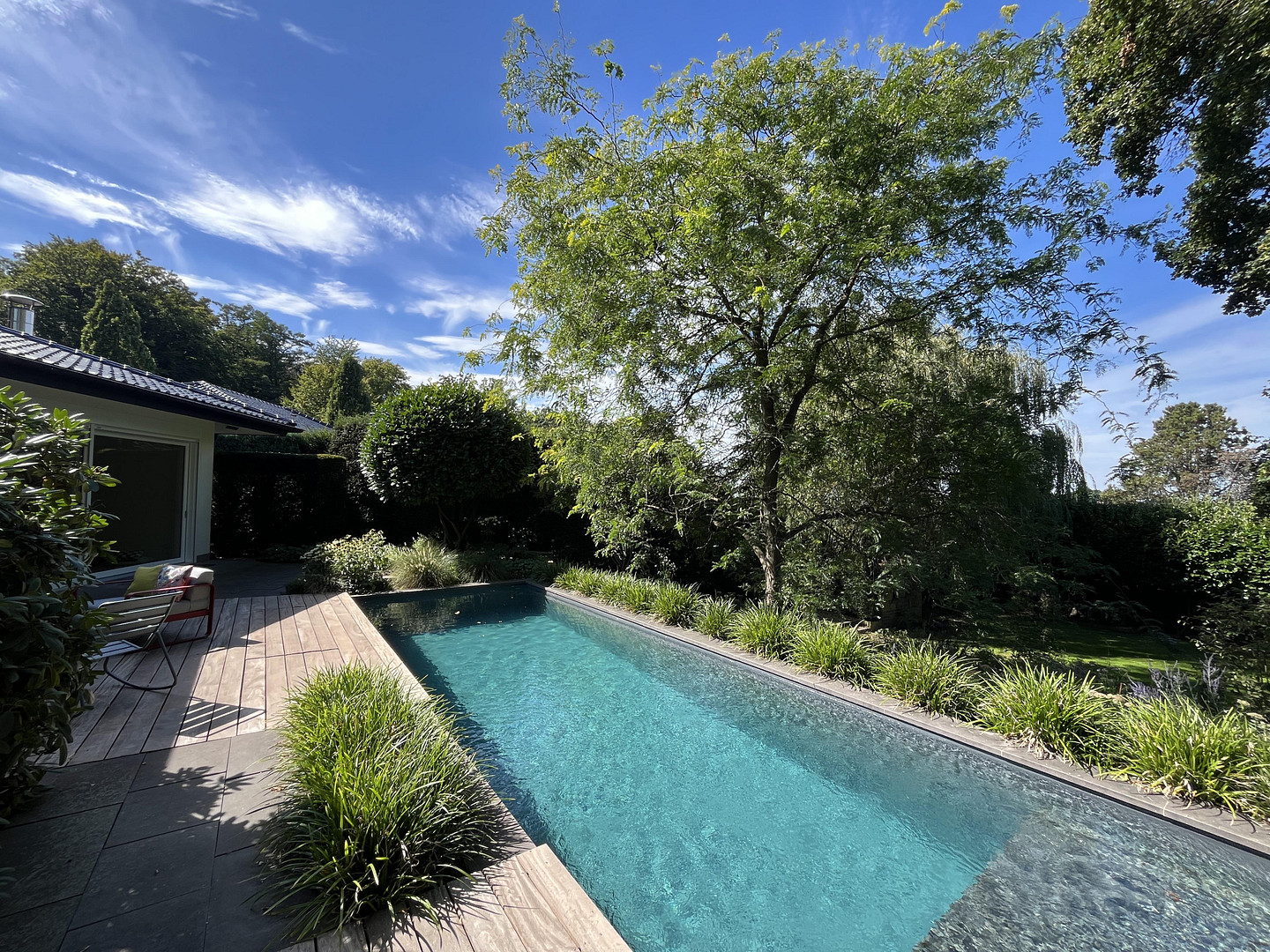 This property is more than just a house - it is a consciously designed living space in which architecture, nature and tranquillity form a harmonious whole. Floor-to-ceiling windows open up views of the garden, the sparkling water of the natural pool and the surrounding vegetation. One breath - and everyday life falls away.