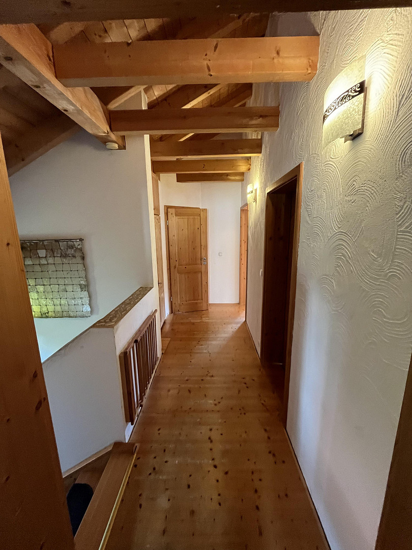 The house is heated with oil and has a large brick wood-burning stove in the living room. A photovoltaic system is installed on the roof for the house's own use.