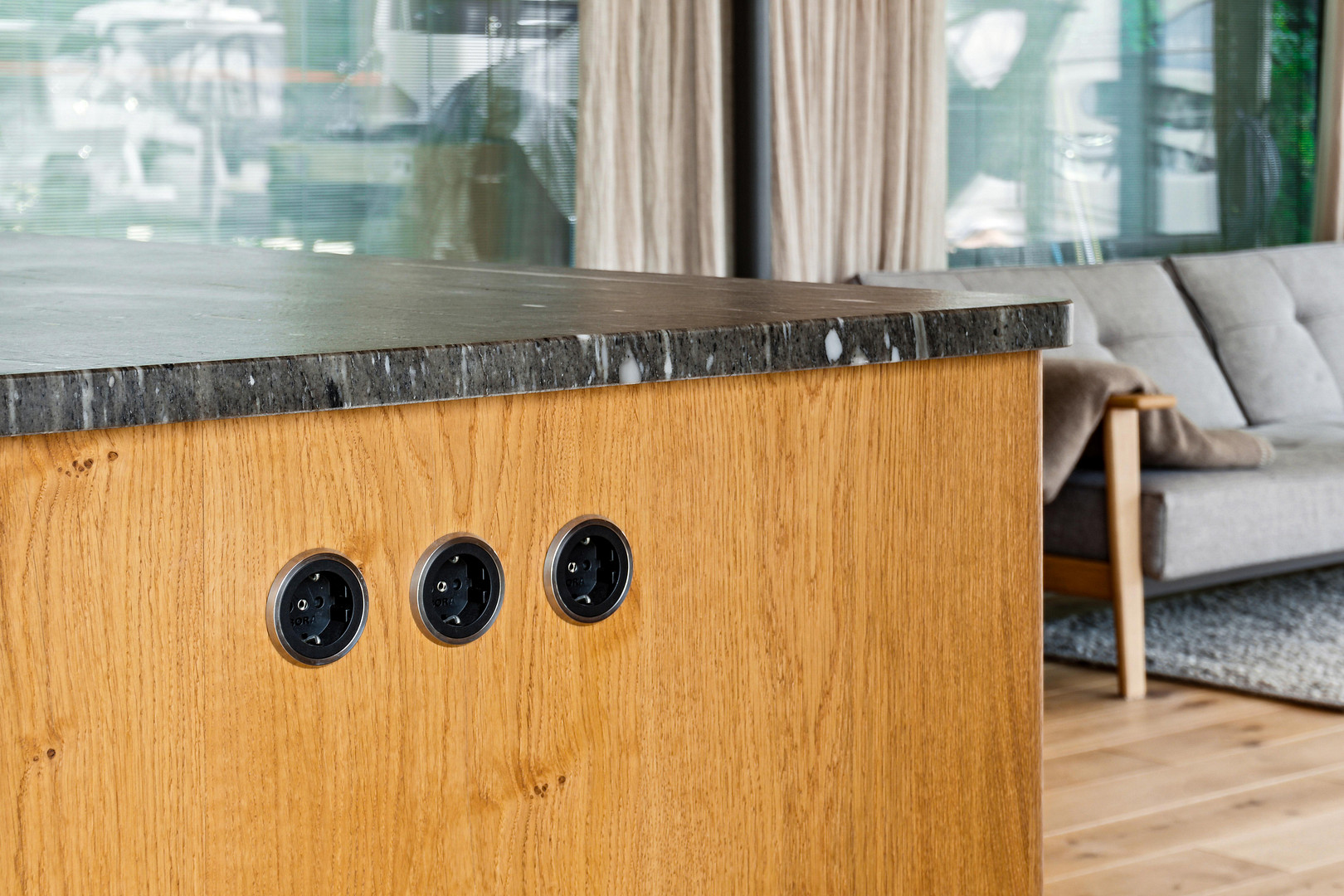 - Real wood kitchen with natural stone countertop