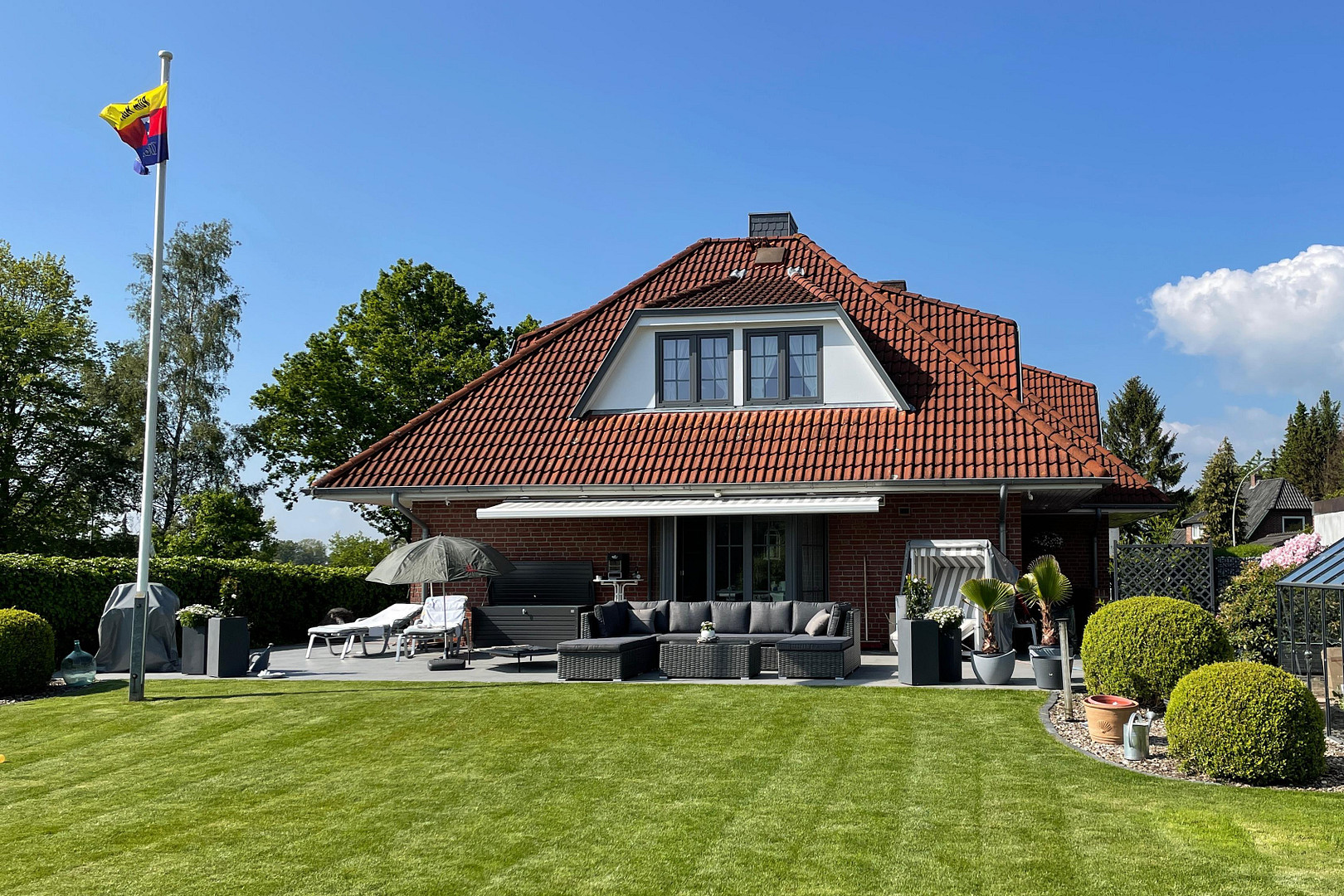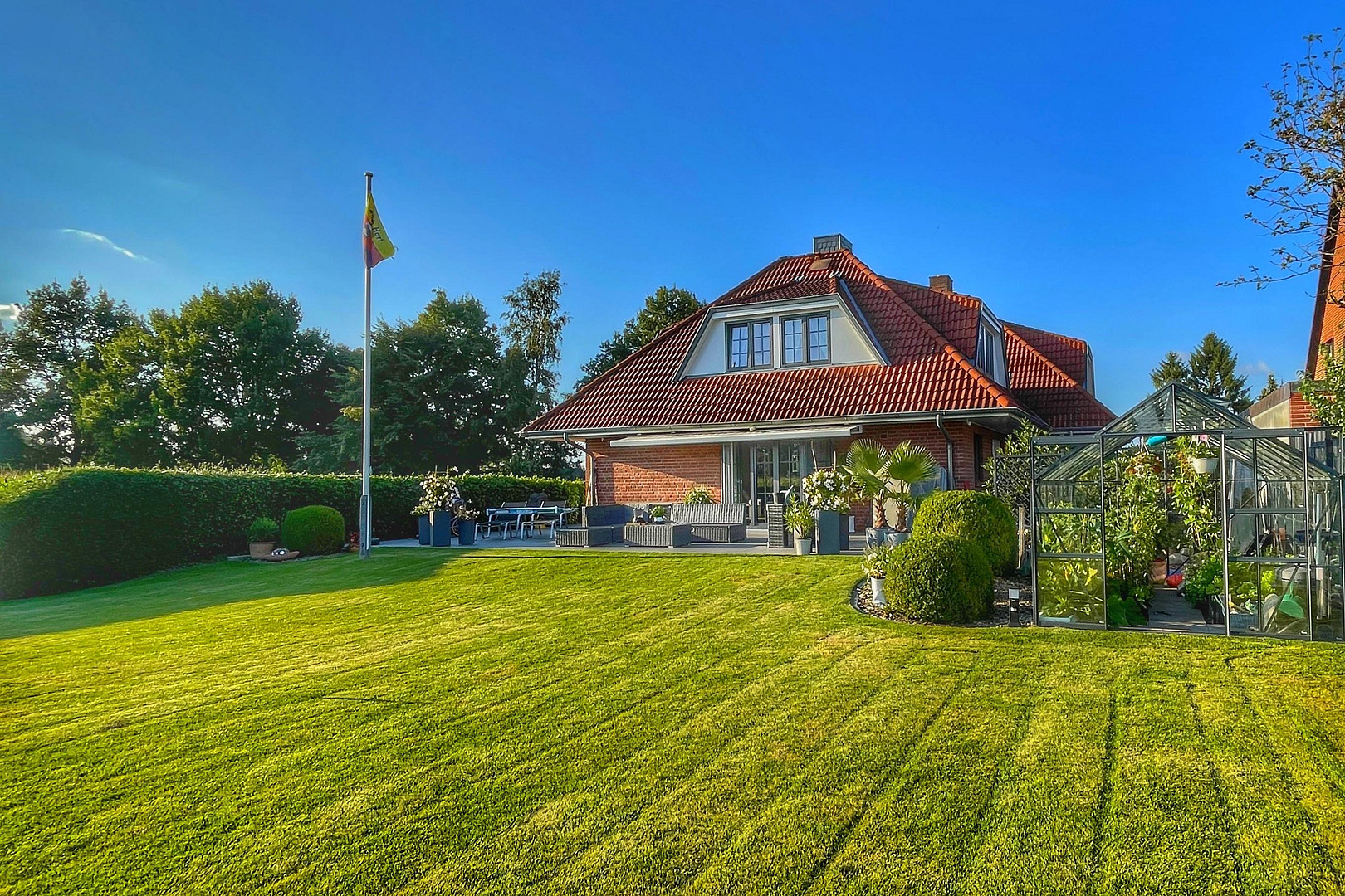 The spacious living/dining/kitchen area opens onto a truly special and exceptionally well-maintained garden. Here, you can find peace and relaxation, with an incredible view over the fields. Approximately 160 square meters (!) of exclusive ceramic tiles have been laid for the surrounding terrace. In the evening, you can observe deer and pheasants, and watch the sunset, enjoying a glass of wine or a sundowner. For lovely parties, there is a high-quality party house with a terrace, from which you have a wonderful view of the exclusive house. The newly installed high-end windows (with triple glazing) add a touch of luxury to the elegant red brick facade of the house with its hip roof. A fireplace with a large glass front in the living room is perfect for cozy evenings. The elegant, open-plan white kitchen with a bar area invites you to cooking evenings with friends. A white wooden staircase leads to the equally spacious upper floor. Here, you will find a very large bedroom with an ensuite bathroom. The exclusive bathroom, featuring a granite countertop, a corner bathtub, and a rain shower, has also been equipped with a sauna. Here, truly wonderful ideas have been realized. The balcony, which also offers a unique view, is perfect for the evenings, where you can enjoy the most beautiful sunsets. In the basement, there is plenty of space for your hobbies, a home office, or even for guests, as there is a second entrance to this area. Recessed spotlights, a ceiling height of 2.30 meters, and underfloor heating are also included. The new heating system, installed in 2023, can be conveniently controlled via an app, as can the house's lighting system and video surveillance. You are acquiring a true oasis of relaxation, uniquely designed and individually tailored! The energy performance certificate is available for viewing.