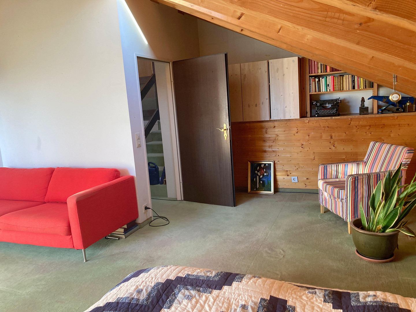 We bought this house because it was the most interesting property in the area around Munich. We need to sell it because our sons live abroad and we are too old to manage it. After a six-month search around Munich, my wife discovered this building project because she could read architectural plans, and the split-level design went against the prevailing norms. While we were at the sales booth on the construction site, a man was studying everything very intensely and asking factual, technical questions. Later, in the beer garden with a view of Ebersberg and the surrounding landscape, including "our house," the conclusion was: buy. We both bought properties, and at that early stage, we were still able to choose a house with the best location. The location has become even better because the new shopping center with doctor's offices (and the old town center) are within walking distance. The civil engineer who oversaw the project bought the fifth house in our row. With his help, we were able to customize the interior design. The tile stove, a traditional Tyrolean design, was built by the master craftsman Gar and his son. The tiles are from the artist's workshop in Wasserburg. The sunroom with underfloor heating has become the focal point for the family. There isn't a parallel row of houses because the small development (only eighty detached houses) was designed like a village. In front of us is the Klostersee lake, and the boys used to go there in their swimsuits. We are located on the mountain of Ebersberg, in a nature reserve right outside our door. We would still love to be there.
