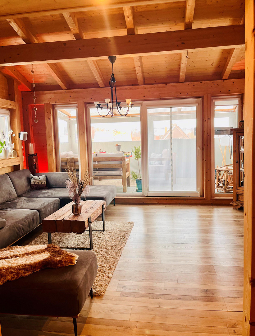 Children's room, bedroom with dressing room, bathroom and a very bright living room. From here there is access to the large, covered terrace, which can be closed all around if required - perfect as an additional living area from spring until well into the fall.