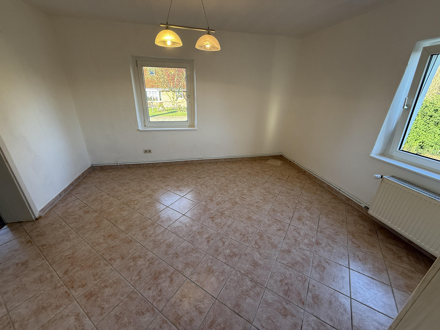 From the rear entrance area with covered terrace, you enter a small hallway. The first living room or conservatory, the bathroom, the kitchen and the stairs to the upper floor are located here. The 1st partial cellar is also accessible from here.