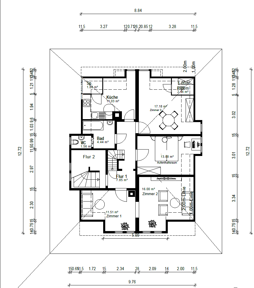 There is also a shared lounge measuring approx. 13.3 m². There you will find a dining table with chairs and a cozy seating lounge, perfect for chilling out, eating or simply for relaxed evenings in the shared flat.