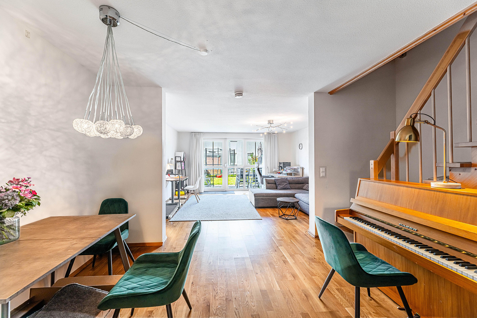 On the first floor, you will find a bright, approx. 34 m² living room with access to the sunny west-facing terrace - ideal for relaxing evenings and convivial moments. A separate kitchen, a guest WC and an inviting entrance area complete this level.