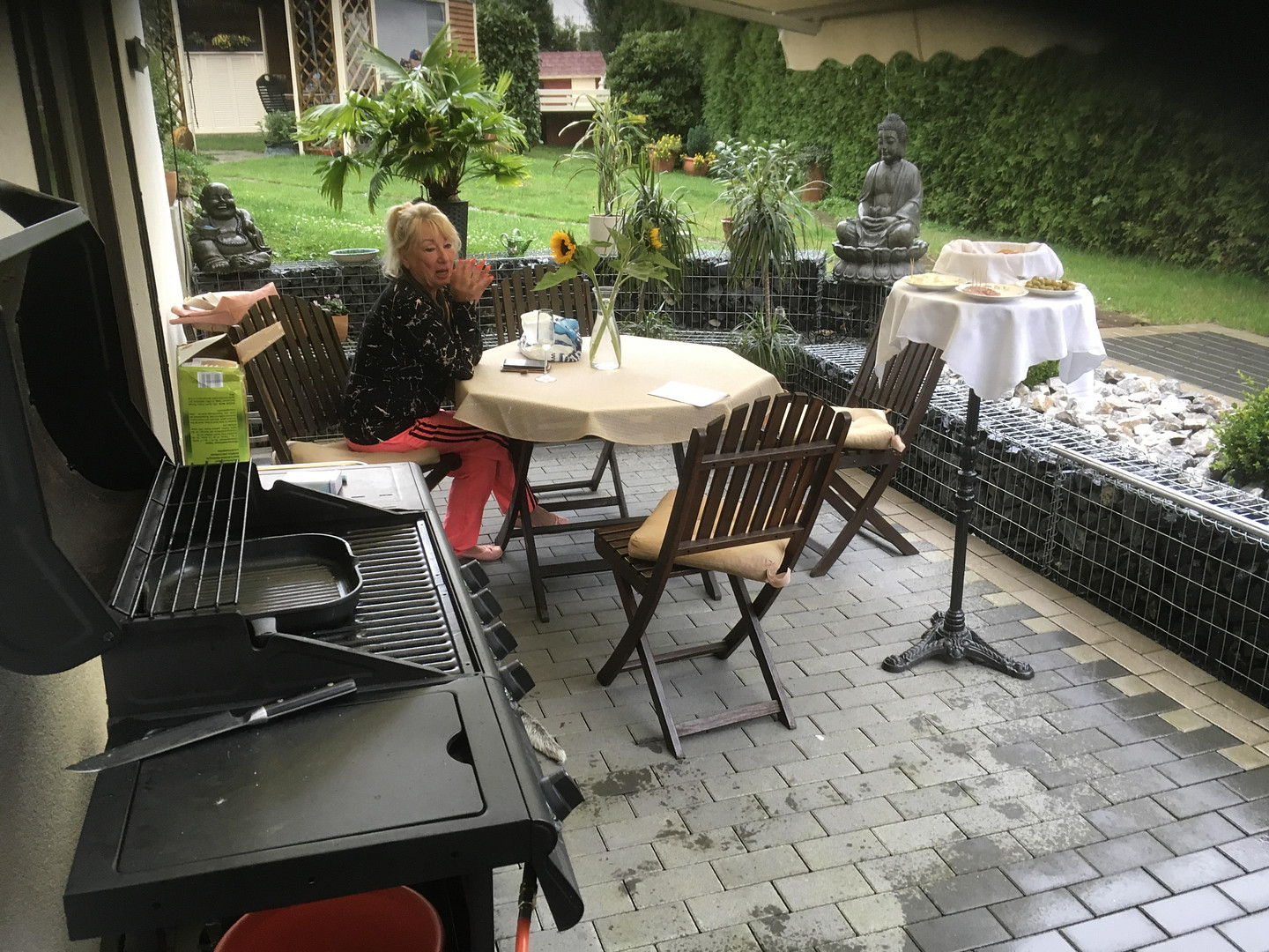 Upper floor with 96 m2 with bathroom in the bedroom and floor-level shower and toilet, second bathroom with shower and bathtub and toilet, both apartments have their own entrance and each has its own terrace and garden access In the garden there is a small pond and a round pool 5.5 m high.