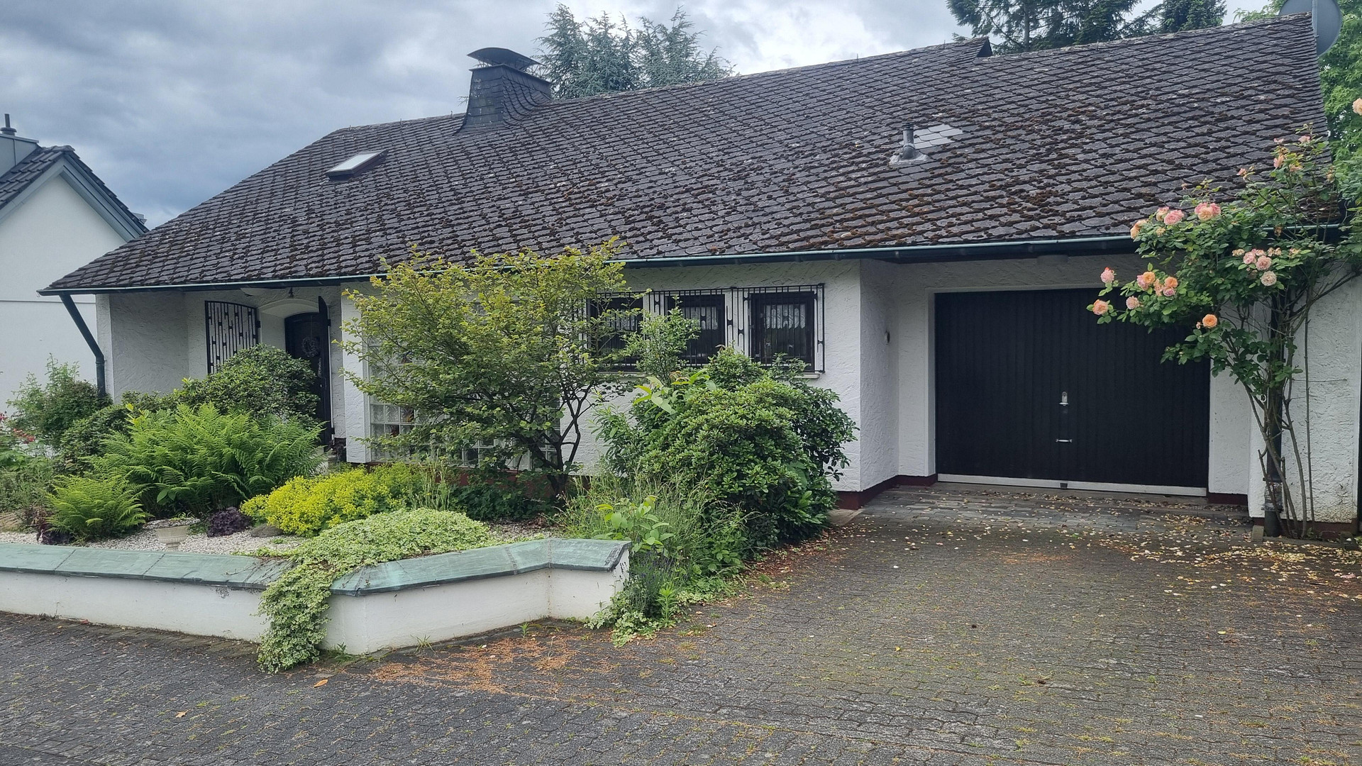 The garden has been lovingly landscaped with numerous evergreen shrubs and perennials. The lawn is mowed with a robot lawn mower (Husquarna), which remains with the new owner.