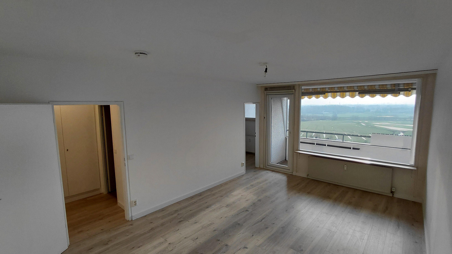 The spacious living/bedroom forms the focal point. The brand-new kitchen and a sunny loggia with electric awning branch off from here.