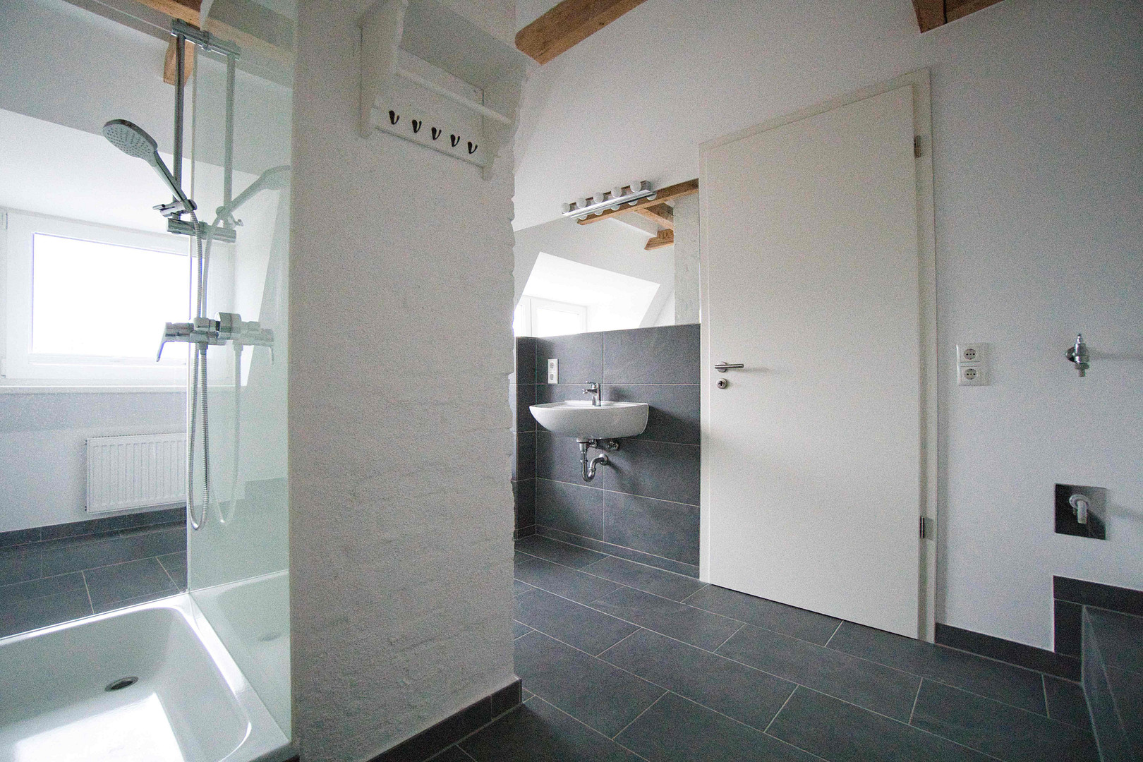 The shower room impresses with its clear lines, high-quality materials and a window that makes the room bright and friendly. A washing machine connection is of course available.