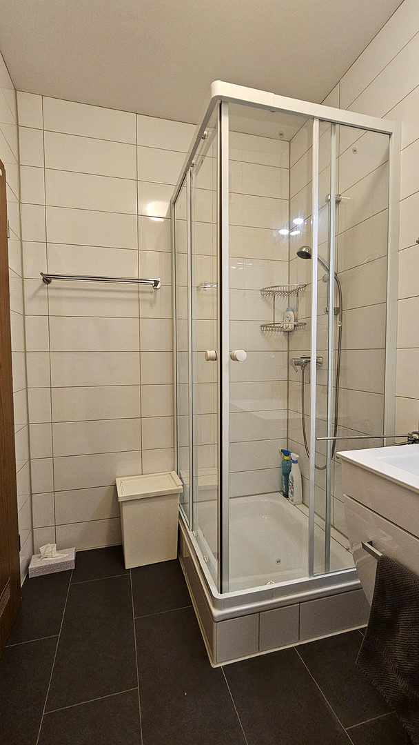 Fully tiled, shower with glass doors, washbasin cabinet, WC, mirror cabinet
