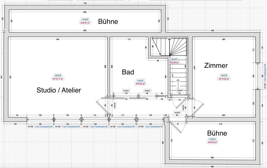 Upper floor: The upper floor consists of a room and a studio (atelier) with high ceilings and another bathroom.