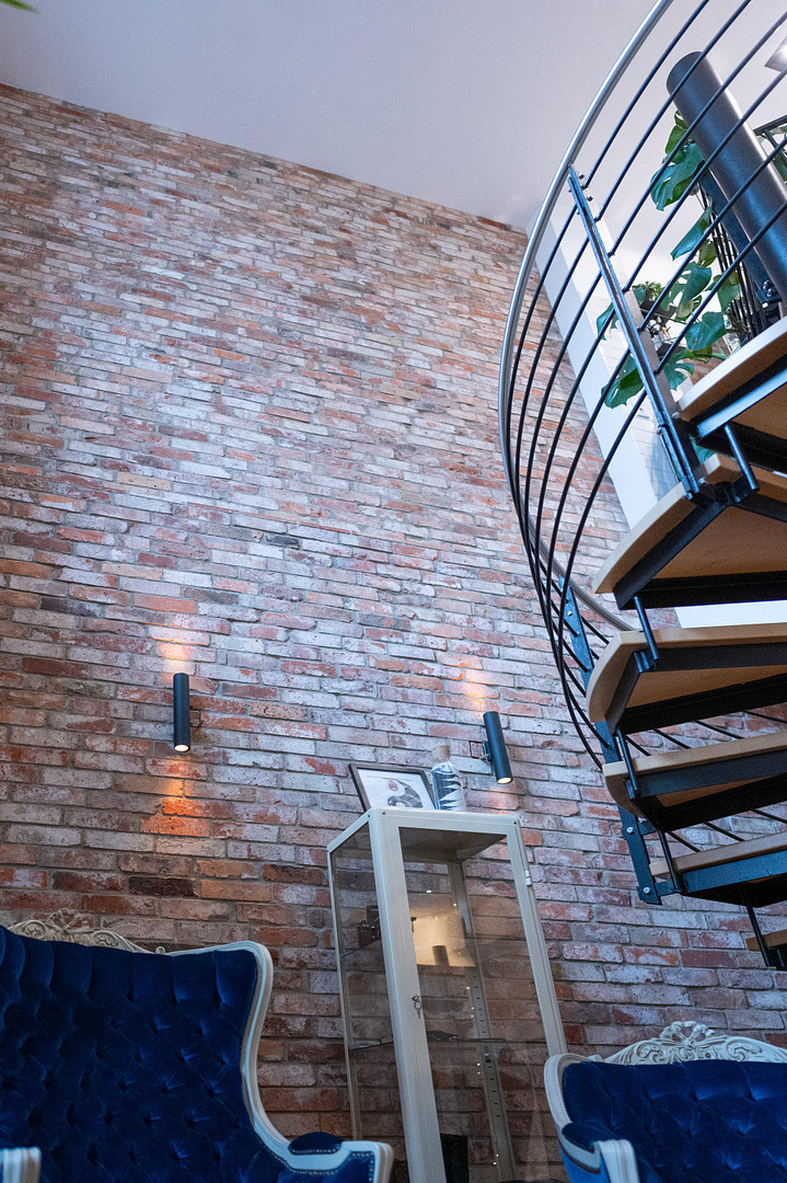 The spiral staircase from the kitchen into the living room is a visual highlight. Behind it rises a wall approx. 7 meters high, clad with historic clinker brick slips - a truly unique piece with an impressive loft character.