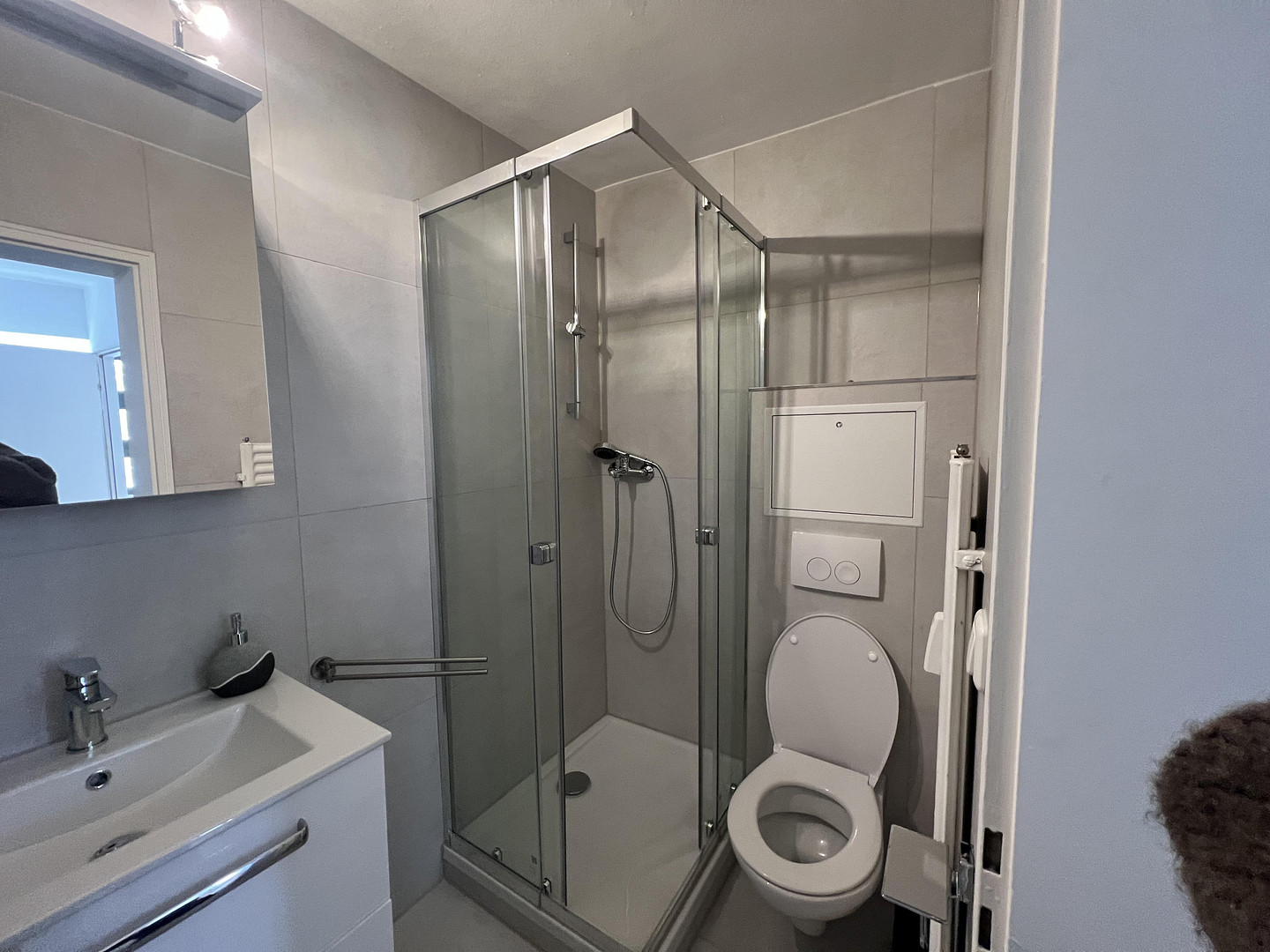 The bathroom is newly renovated and has a modern shower, washbasin and WC.