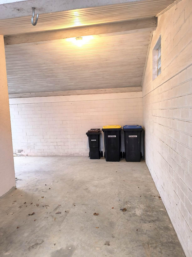 Rainwater tanks are located in front of and behind the shed. They are reliably supplied with rainwater from the roof and are generally sufficient in practice to water potted plants around the house and the front garden. The shed is very spacious and was used as a covered utility area. It can accommodate garden furniture, firewood, bicycles, trash containers, and much more. A vehicle can also fit inside.