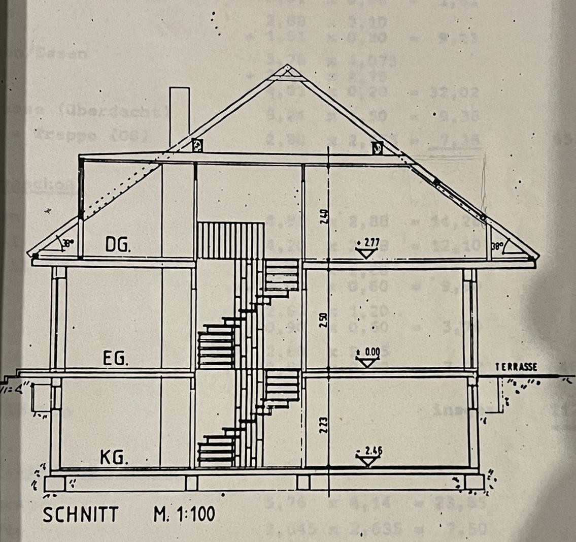 The two bedrooms and the bathroom are accessed via an open staircase on the upper floor. Unlike in the construction plan, the rooms KIND1 and KIND2 have been combined and joined together as one large room. Room ELTERN is now the children's room.