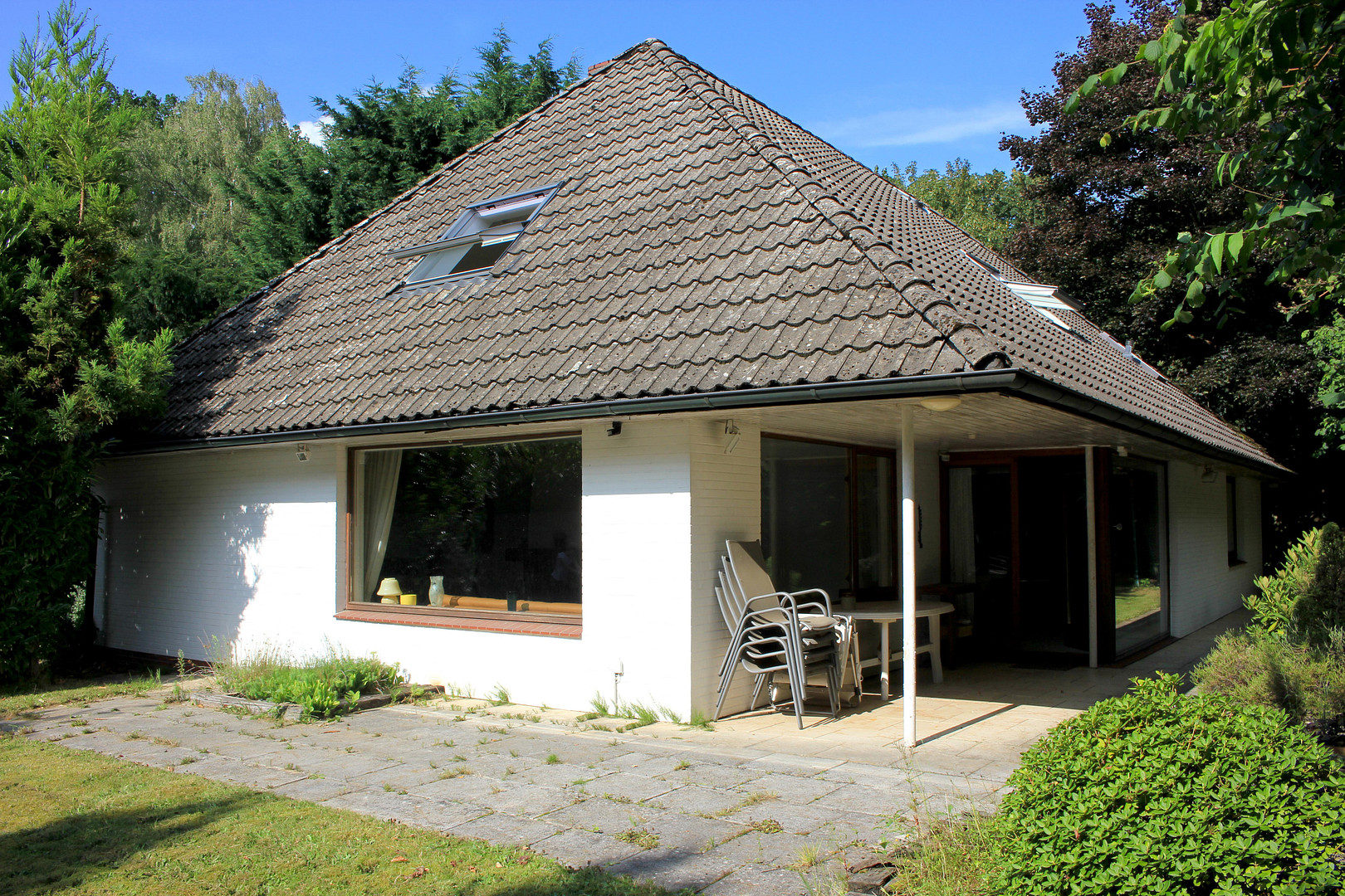 Due to the long driveway, the house is located well away from the small street and the garden is not visible. The front garden is south-facing and a spacious, partially covered terrace invites you to live outside. Behind the house there is space for a swing, garden shed and compost.