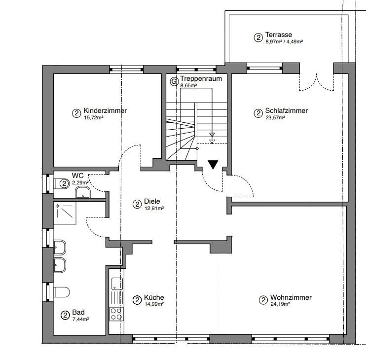 It has a total area of 105.9 m² and offers 3.5 rooms as well as an approx. 9 m² terrace with a view of the greenery.