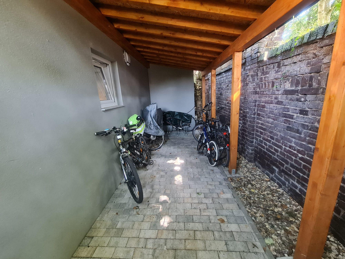 The house has a full basement. On the garden side of the building there is a side extension which is rented out to a tenant. A shelter behind the side extension serves as storage space for bicycles and baby carriages, for example.