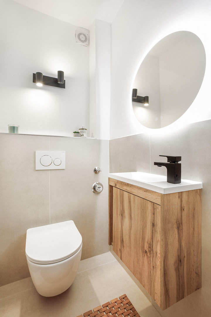 - Bathrooms: New, modern bathrooms (guest WC and main bathroom) with stylish large-format beige tiles (60x120) and contemporary sanitary ceramics (e.g. rain/walk-in shower).