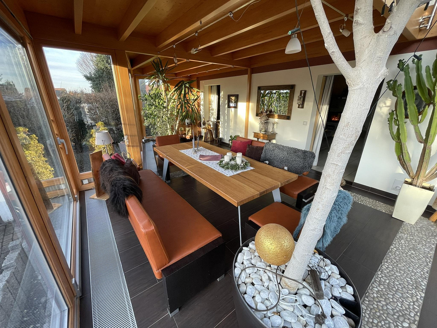 The focal point of the house is the very spacious living and dining room with an open transition to the kitchen. The high-quality soapstone stove creates a cozy atmosphere here. From this area, you have direct access to the impressive conservatory, the terrace and the spacious garden - ideal for relaxing with family and friends.