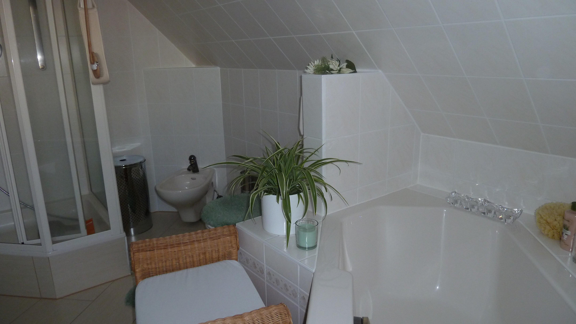 On the upper floor there is a bedroom, an office and a spacious guest or children's room with a wonderful view of the greenery. A large bathroom and a small separate room which can be used as a walk-in closet complete this floor. A folding staircase leads from the hallway on the upper floor to the attic.